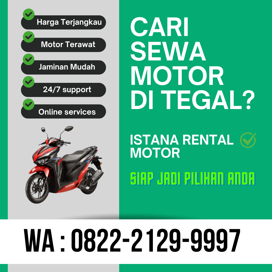Di Tegal dan banyak kota lainnya, layanan sewa motor sangat mudah ditemukan. Anda bisa memilih dari berbagai penyedia sewa motor dengan harga dan layanan yang sesuai dengan kebutuhan Anda. Biasanya, proses penyewaan motor cukup mudah dan cepat, sehingga Anda bisa langsung memulai perjalanan setelah menyelesaikan administrasi sewa. Beberapa tempat penyewaan juga menawarkan motor dalam kondisi baik, yang akan memberikan kenyamanan dan keamanan selama perjalanan.